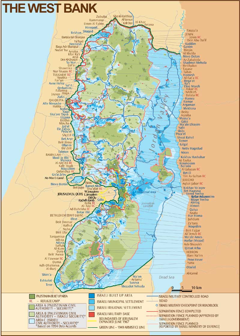 The Palestinians are being crowded into ever smaller areas. Israel is now destroying houses and forcing Palestinians out of what the Oslo Agreement defined as “Area C” (here shown in blue), leaving them with only the green areas.