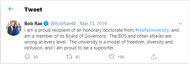 Rae has been honoured with a doctorate from Haifa University in Israel (a distinction he shares with a few other well-known Canadian Zionists including Irwin Cotler, Jason Kenny and Avi Benlolo).