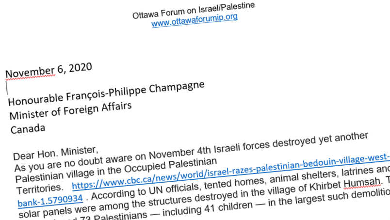 EU countries protested Israeli demolition of Palestinian homes in Khirbet Humsah, (above) on 3 Nov. 2020. But the Trudeau Government looked the other way. Our official policy opposes the Israeli occupation of the West Bank. But our real policy appears to be something else. Read OFIP’s open Letter to Minister Francois-Philippe Champagne inviting him to clarify what Canada’s real policy is. Read more…