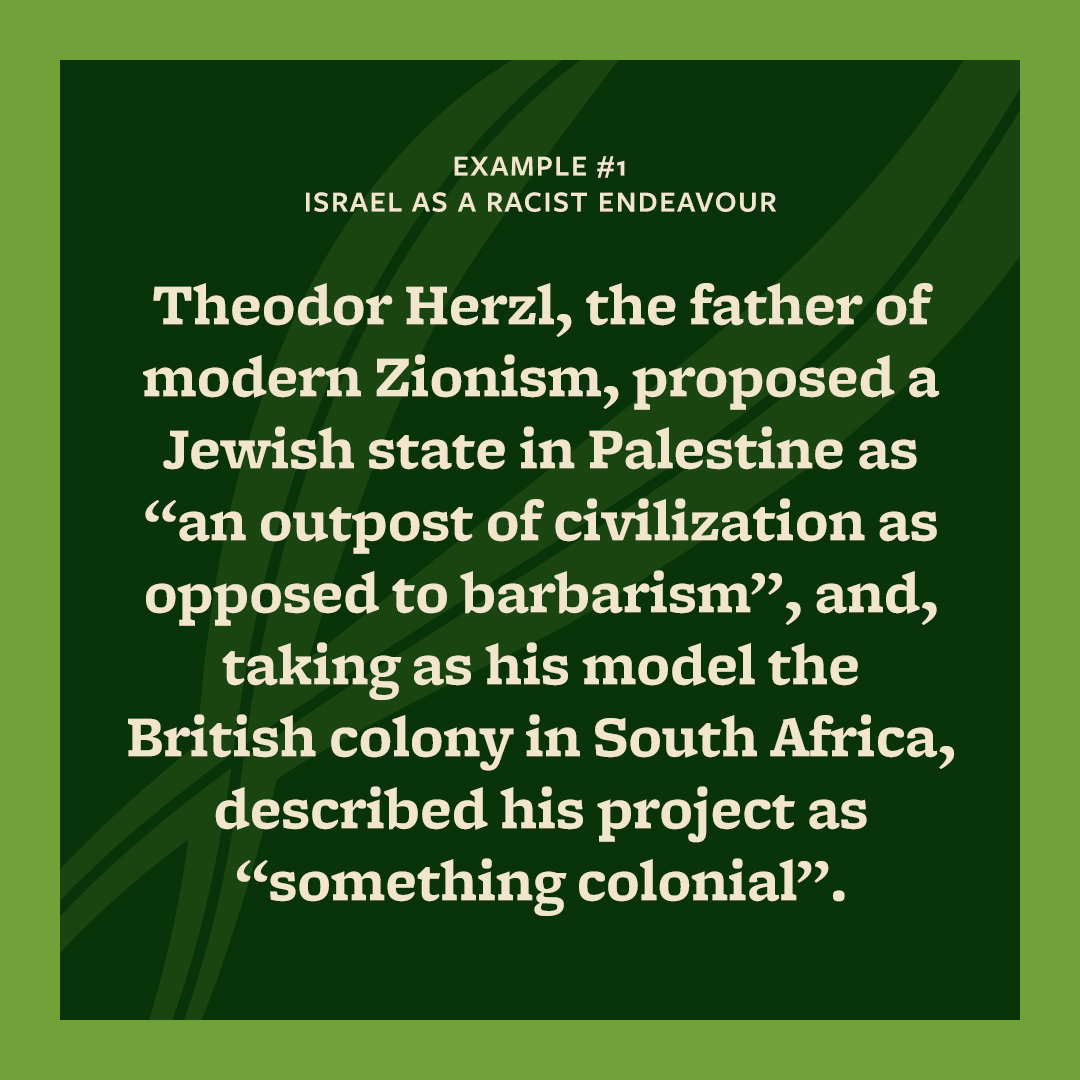 Example #1 starts with a reference to a letter from from Theodor Herzl, the father of modern Zionism to Cecil Rhodes, one of Britain’s best known colonialists. Hertzl’s vision of a “Jewish State” was clearly based on a notion of Jewish racial superiority over the barbaric Arabs.