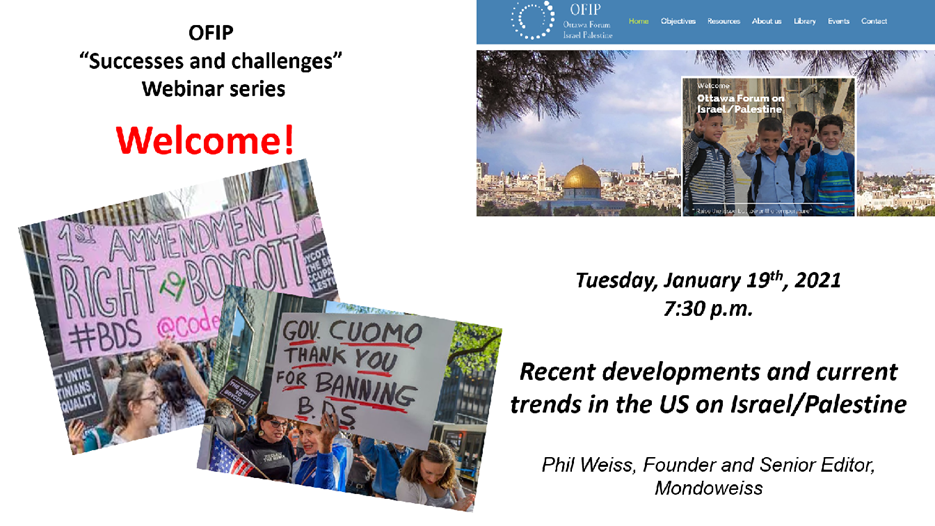 Phil Weiss, as Senior Editor of Mondoweiss, is a keen observer of the US political scene and has been watching the contradictory developments in the US on the Israel/Palestine file over the last 4 years. In an OFIP webinar on January 19th, he will make an assessment of where things are and where they are heading. Register now….