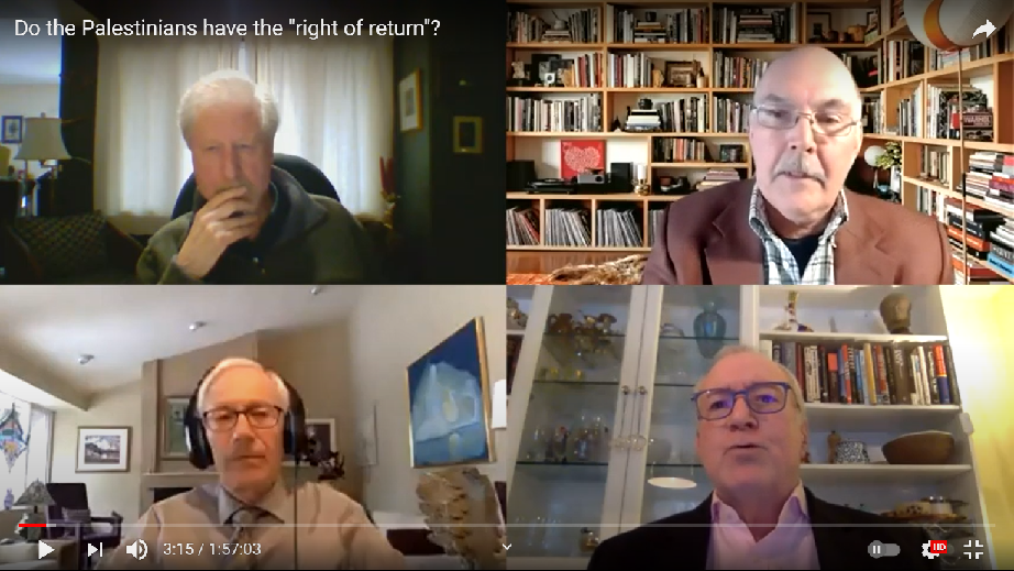 On March 3, a rare public discussion/debate took place in Ottawa on the tricky issue of the Palestinian “right of return”. Ottawa lawyer Jon Snipper, (bottom left) opposes the Palestinian right of return on what he feels are sound legal and moral grounds. OFIP chair Peter Larson (top right) supports it. The session was moderated by former Canadian ambassador Rick Kohler (bottom right) and questions were handled by professor Gerald Wright (top left). Watch the video recording of the event. See what you think. (Warning, its 2 hour long so get a cup of coffee!!)