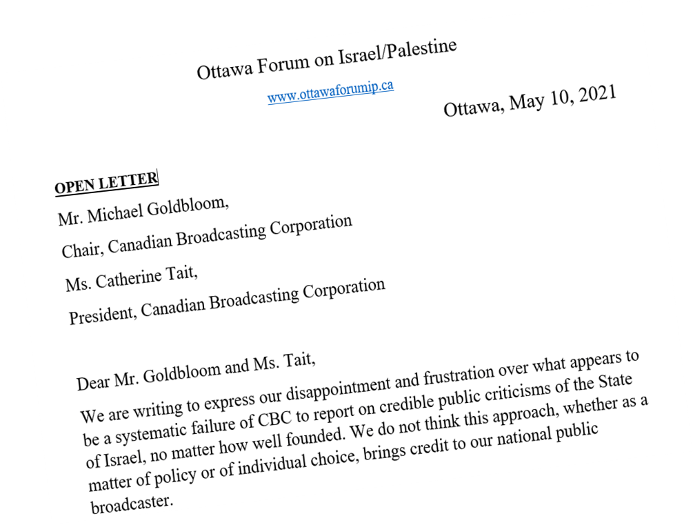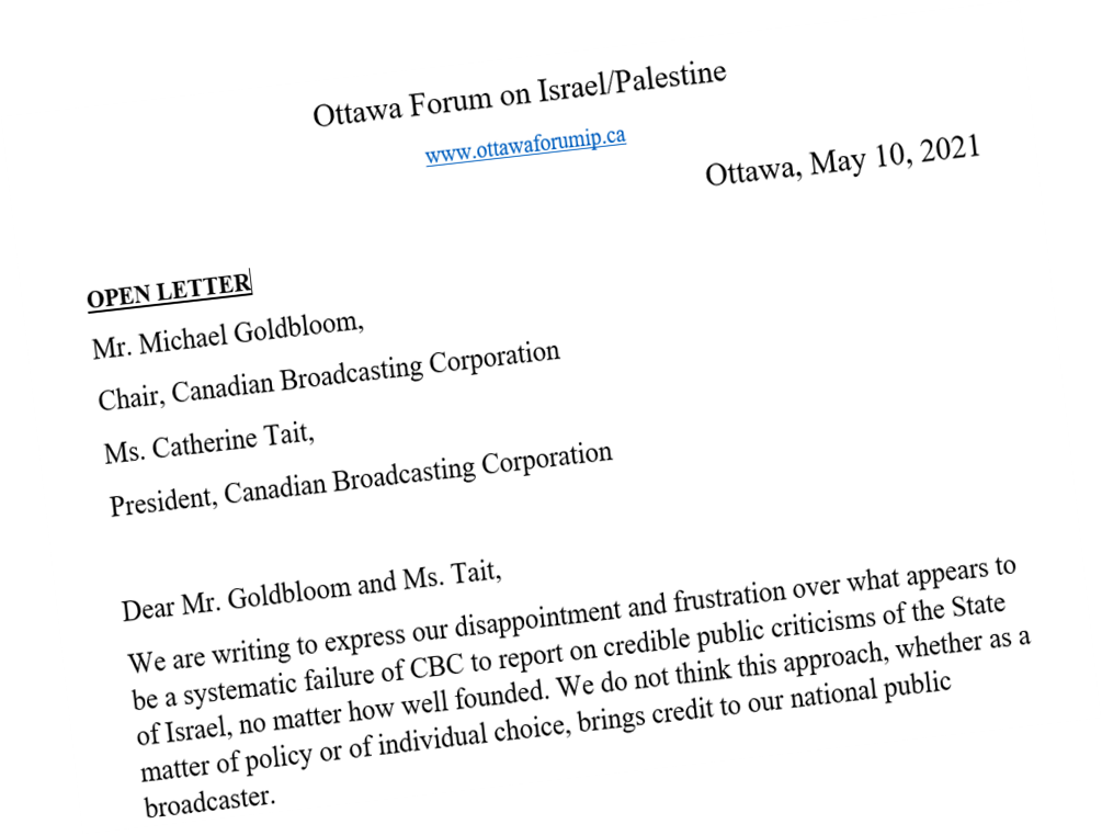We are writing to express our disappointment and frustration over what appears to be a systematic failure of CBC to report on credible public criticisms of the State of Israel, no matter how well founded. We do not think this approach, whether as a matter of policy or of individual choice, brings credit to our national public broadcaster.