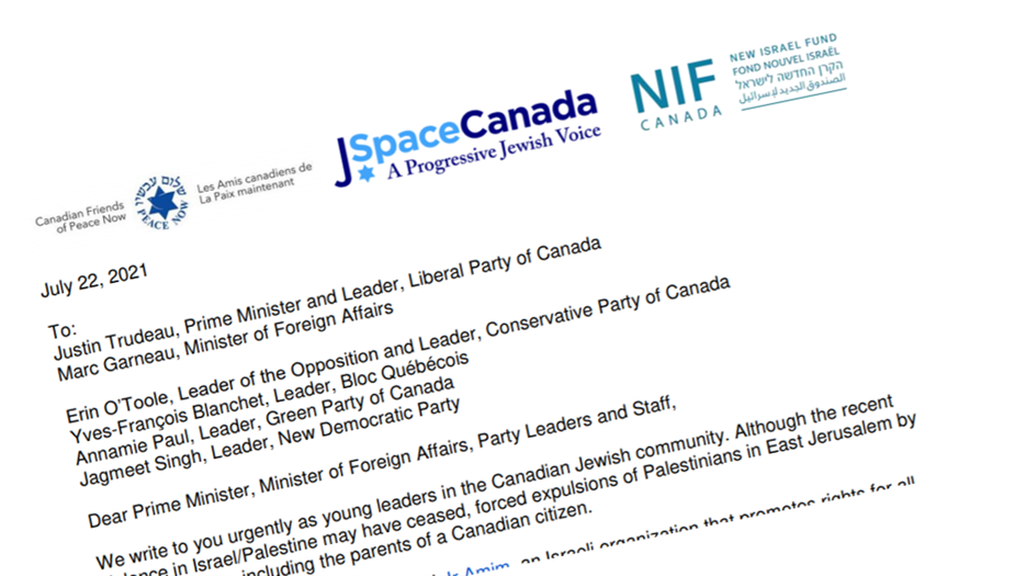 On July 22, 2021, young Jewish leaders from three liberal Zionist organizations (New Israel Fund of Canada (NIFC), JSpaceCanada, and Canadian Friends of Peace Now (CFPN) sent a joint letter to the Canadian government and the heads of all the major political parties urging them to speak out strongly against the forced expulsions and demolition of homes of Palestinians in East Jerusalem: