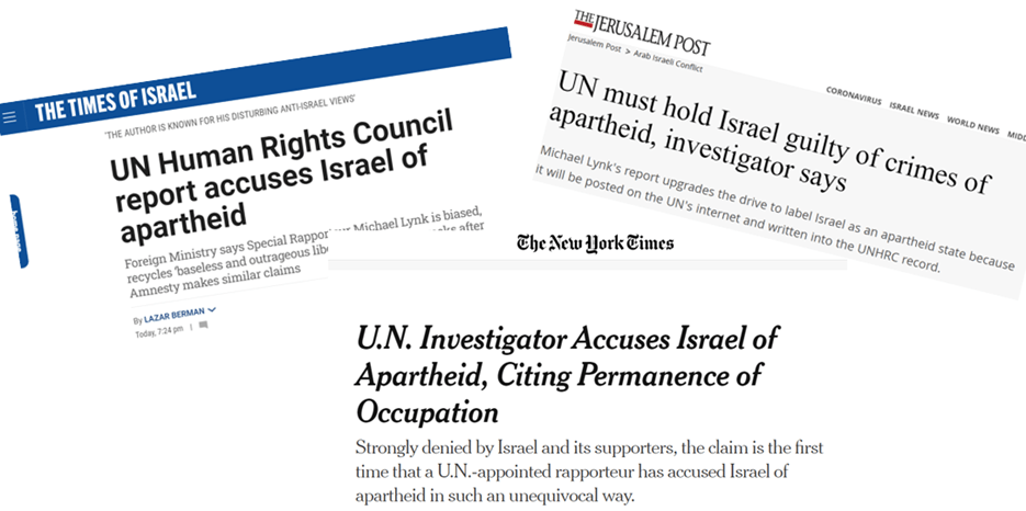 “U.N. investigator accuses Israel of Apartheid, citing permanence of occuption”, noted the New York Times. The NYT article went on to note that “the claim is the first time that a U.N.-appointed rapporteur has accused Israel of apartheid in such an unequivocal way.” (NOTE: The NYT is in error. The first time was in 2017 when the United Nations Economic and Social Commission for Western Asia accused Israel of practicing apartheid.)