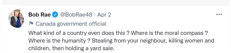 If, on the other hand, Ambassador Rae WAS AWARE of the extensive looting of Palestinian goods by Jewish Zionists, his “moral outrage” over allegations of Russian troops doing exactly the same thing in Ukraine, should be taken with a grain of salt.