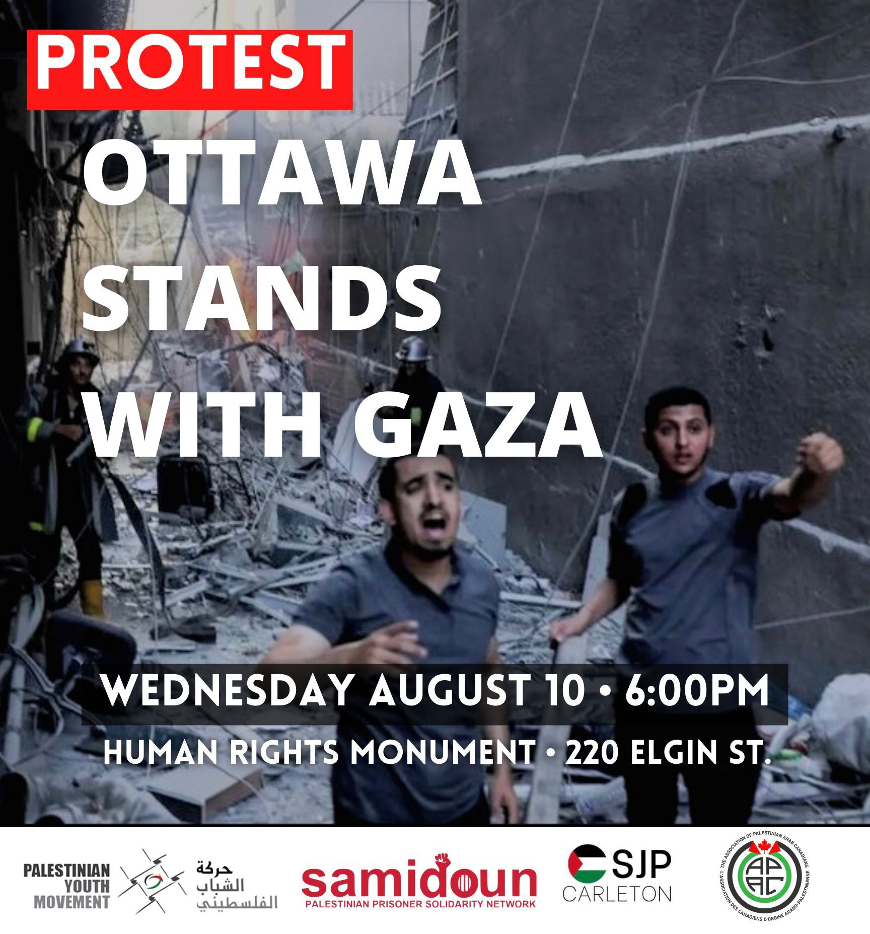 Last minute. A demonstration will be held in Ottawa on Wednesday August 10 to oppose the Israeli bombardment of Gaza.