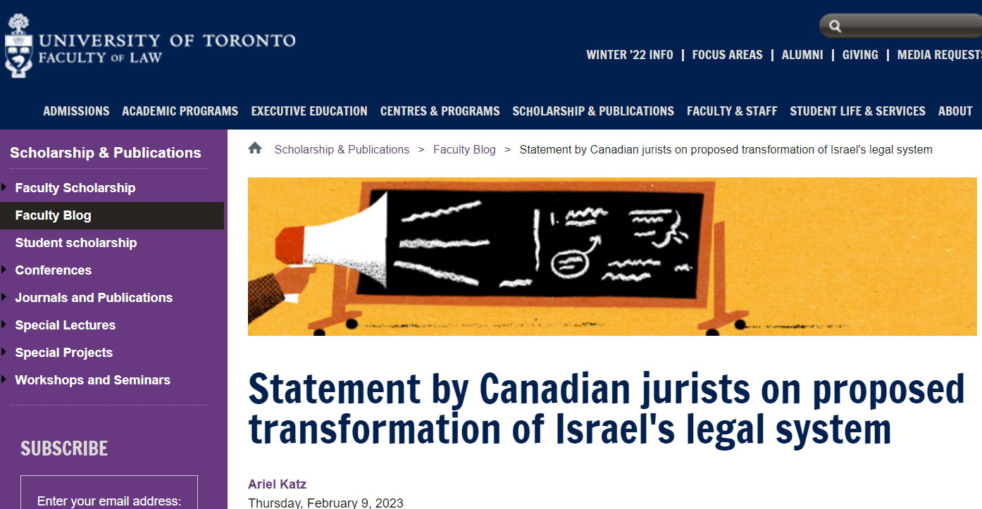 The statement, written by University of Toronto academics Lorraine Weinrib and Ernest Weinrib, accuses Israel of forgetting the lessons of the Nazis’ mass murder of six million Jews. “We write out of concern that recent proposals to transform Israel’s legal system will weaken democratic governance, undermine the rule of law, jeopardize the independence of the judiciary and impair the protection of human rights.”