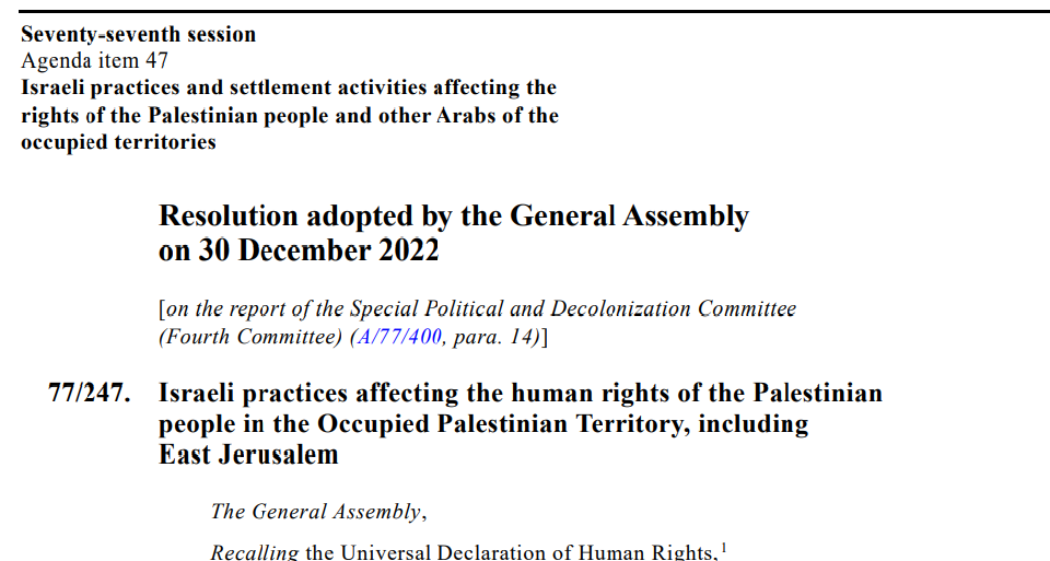 On 30 December 2022, the United Nations (UN) General Assembly adopted resolution 77/247 requesting an advisory opinion from the ICJ on the question of Palestine. The request asked the Court to provide a legal opinion on two specific questions,