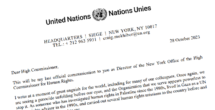Craig Mokiber resigned from his senior position at the UN on October 30th. In a final letter to his boss, Volker Turk, High Commissioner for Human Rights, he praised the UN’s work in human rights in other conflicts, but expressed anger and frustration over its inability to offer the same protection to Palestinians. He offered a radical 10 point program on what the UN and the international community needs to do. Read more…