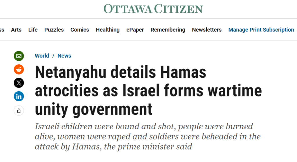 Canadians should be beginning to recognize that Israel has set an impossible goal for itself and that having an unachievable goal is leading to disaster. It has repeatedly stated that its goal is to completely destroy Hamas. They have not said that they want to weaken Hamas, or to demilitarize Hamas, or even to confine Hamas; they say “destroy”. There is only one way to do that; they have to destroy the Palestinian people.
