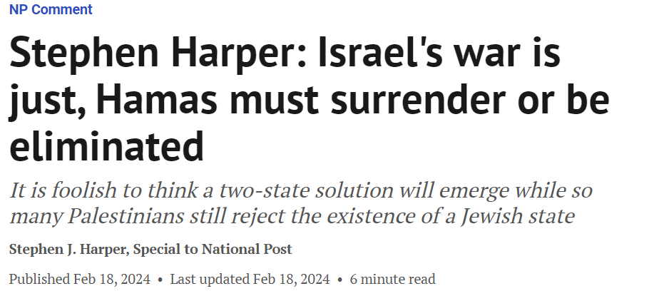 The National Post gave lots of space to former Prime Minister Stephen Harper on February 20th to offer his justification for what he called Israel’s “Just war”.