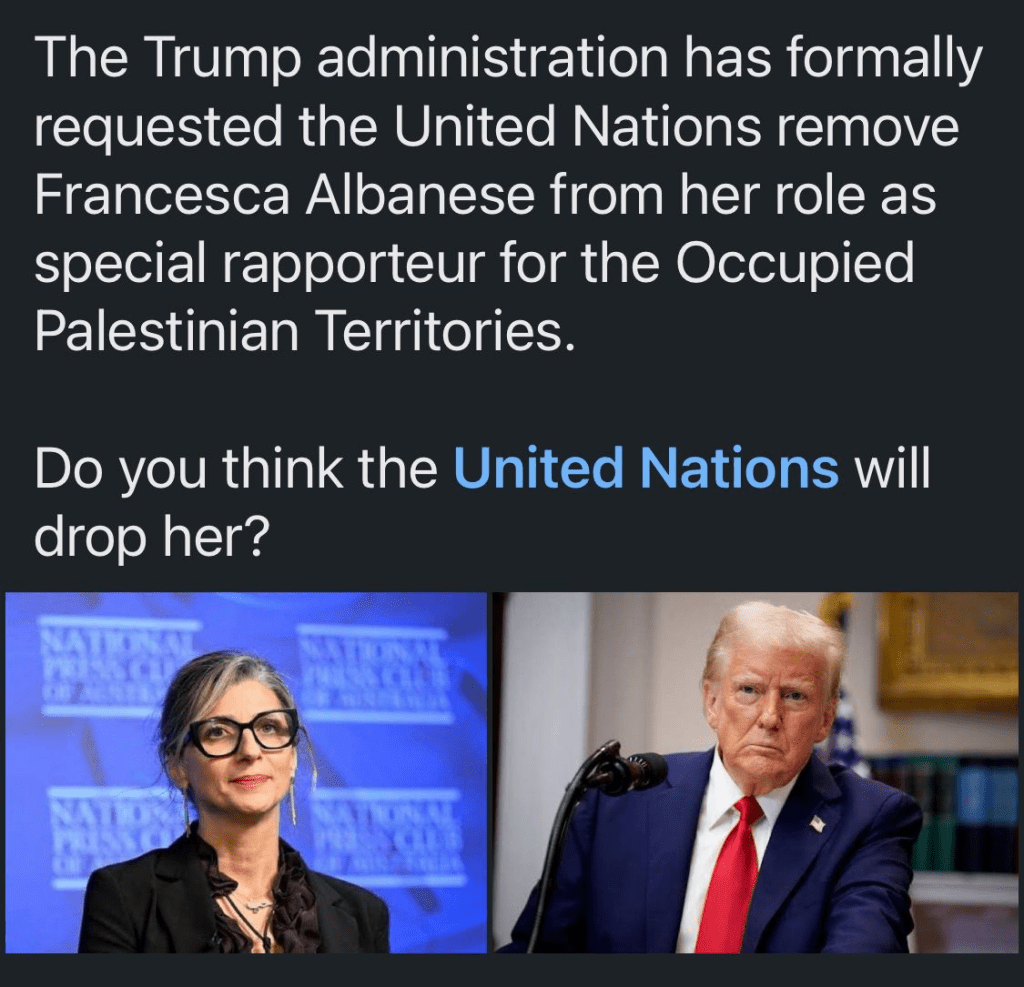 The Trump administration has formally requested that the U.N. remove Francesca Albanese from her role as the special rapporteur on the occupied Palestinian territories, citing her “virulent antisemitism and support for terrorism”. It seems her most recent report, explaining the corporate interests benefiting from the Israeli genocide has made him angry. Why? See our interview with Michael Lynk.