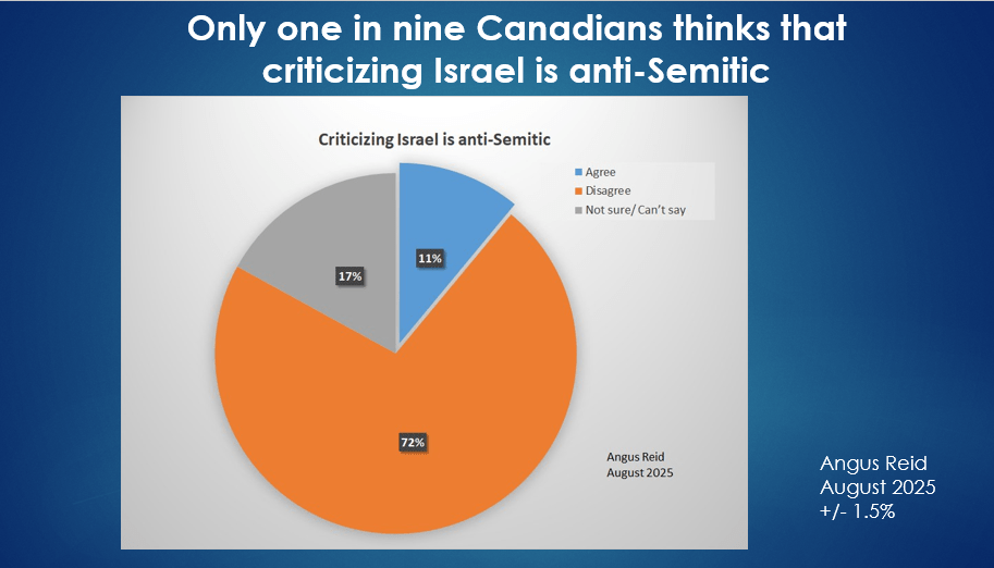 The survey also has another piece of bad news for the Israel lobby in Canada. Only 1 in 9 Canadians think criticizing Israel is necessarily antisemitic!!