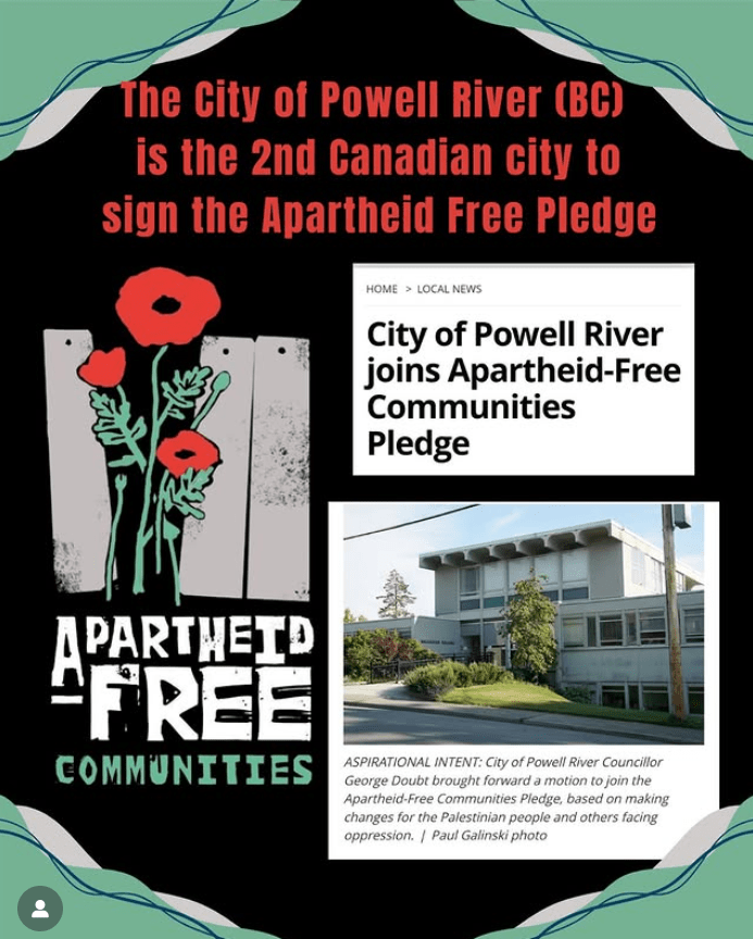 The promoter of the initiative is a British Columbia “affinity group” loosely associated with an international movement against occupation and apartheid called the Apartheid-Free network. It was originally created by faith groups across North America, including congregations, faith communities, but has now broadened to include solidarity organizations, non-profits, campus groups, businesses, and municipalities.