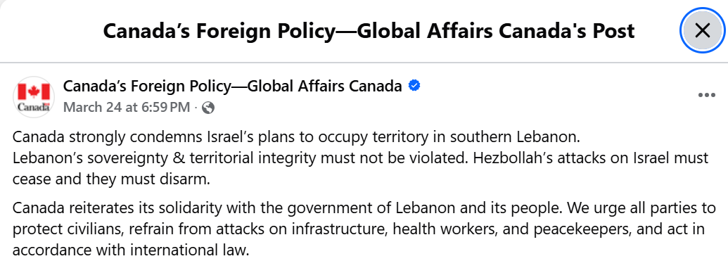 A powerful statement by the Government of Canada has forced Israel to abandon its plans to permanently occupy the south of Lebanon and cease its barbaric bombing of civilians in Beirut. It has allowed Canada to resume the moral high ground established by Prime Minister Carney in Davos.